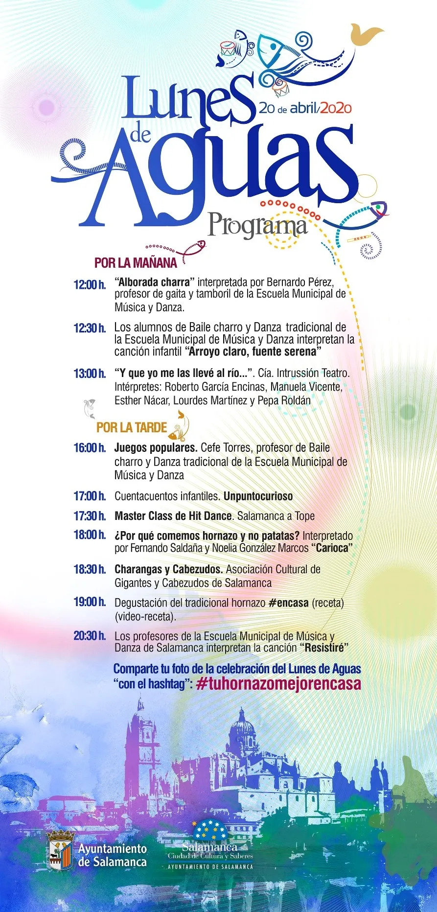 El Ayuntamiento de Salamanca ha elaborado un programa de actividades para que los salmantinos puedan celebrar el Lunes de Aguas sin salir de sus casas. El programa incluye varias propuestas que se emitirán on line a través del canal YouTube del propio Ayuntamiento el lunes 20 de abril.