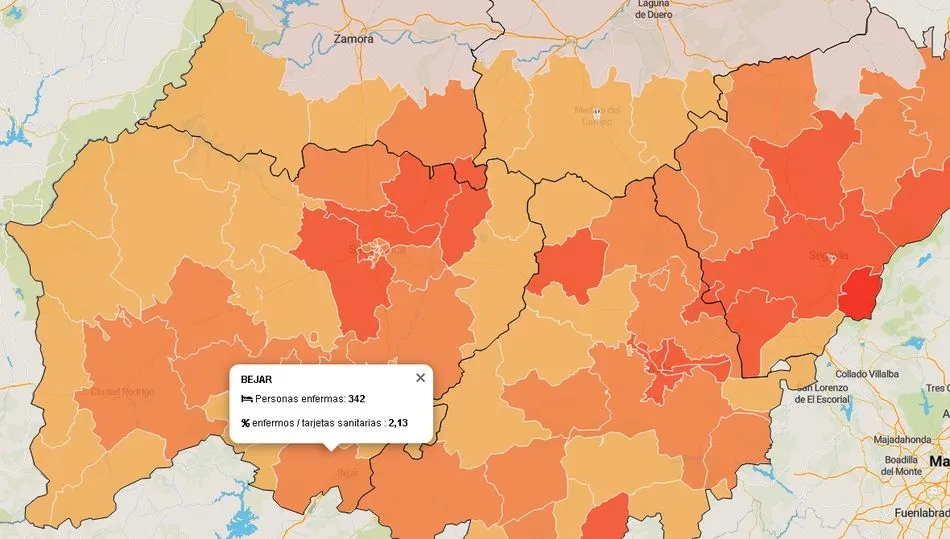 Los datos corresponden a la zona básica de salud de Béjar. Debe tenerse en cuenta que las zonas suelen abarcar más de un municipio, por lo que no debe olvidarse de que los datos corresponden a toda la zona y no exclusivamente al municipio. Los datos de número de afectados y el porcentaje de ellos en proporción al número de tarjetas sanitarias, son facilitados oficialmente por la Junta de Castilla y León