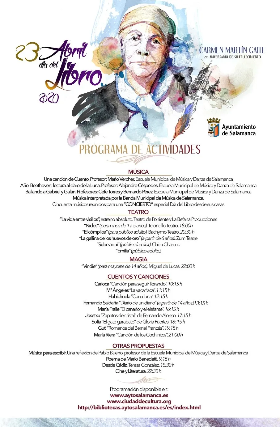 Para que los salmantinos recuerden esta fecha en el calendario cultural de la ciudad, el Ayuntamiento ha elaborado un programa de actividades virtual relacionadas con el mundo de las letras, que incluye teatro, cuentacuentos, música y exposiciones, en el que han colaborado la Red de Bibliotecas Municipales, la Fundación Salamanca Ciudad de Cultura y Saberes, la Escuela Municipal de Música y Danza y la Banda Municipal de Música.