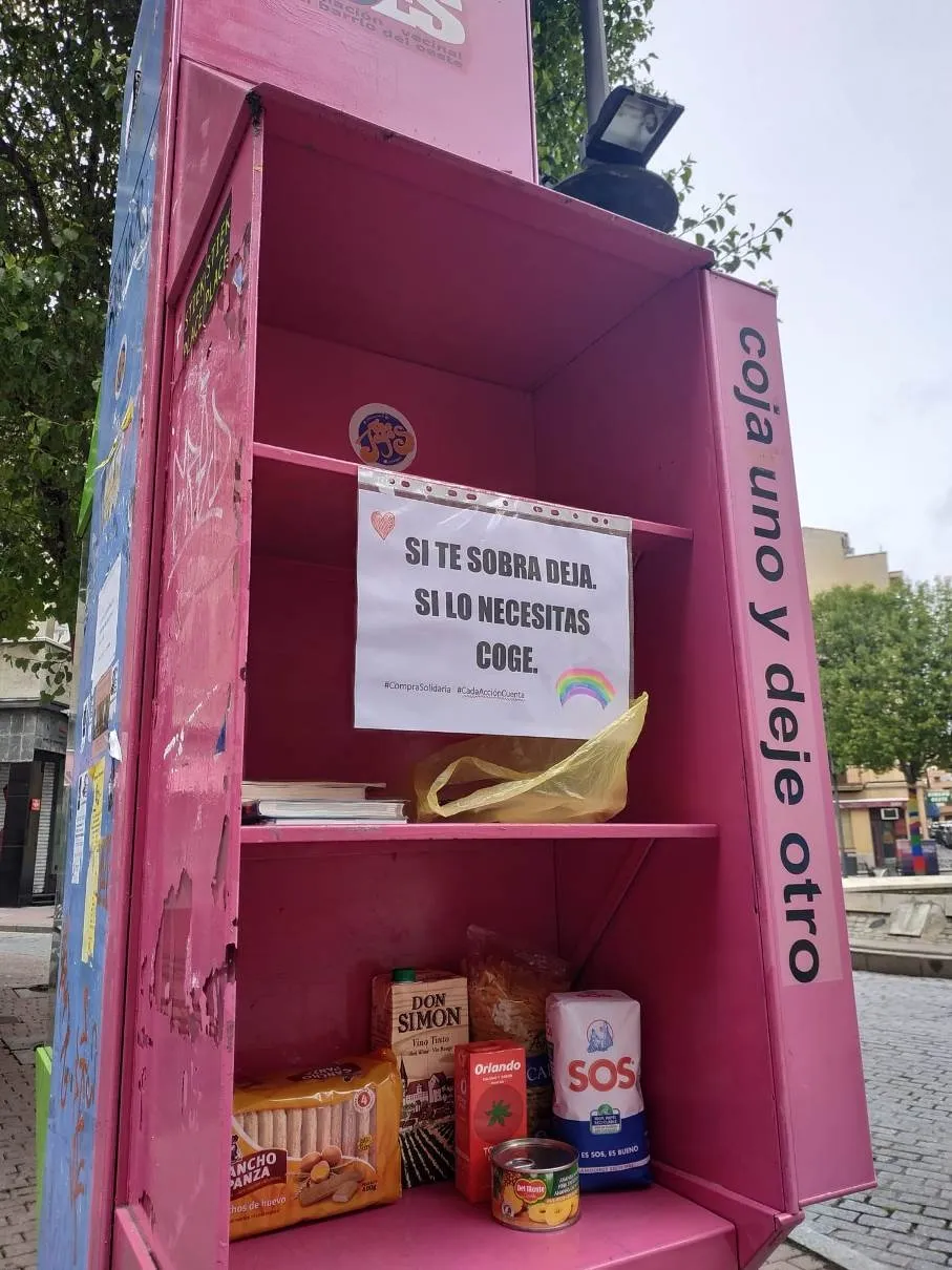De momento, en ese espacio público han donado un kilo de arroz, un paquete de bizcochos o un litro de vino, entre otros productos. Además, han pegado un cartel en el que se puede leer: ?Si te sobra, deja. Si lo necesitas, coge?.
