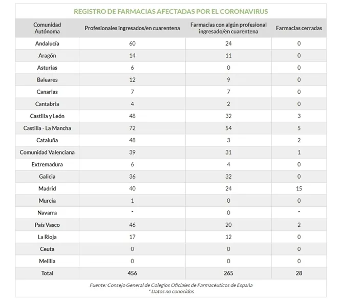 Desde el comienzo de la crisis 12 profesionales de la farmacia, diez farmacéuticos y dos técnicos en farmacia, han fallecido, siete en Madrid y uno en La Rioja, Granada, Ciudad Real, A Coruña y Alicante.