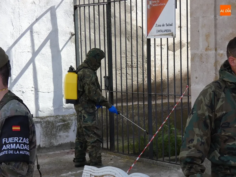 Militares del Regimiento de Especialidades de Ingenieros número 11 de Salamanca se han desplazado esta tarde a realizar la desinfección del Centro de Salud de Cantalapiedra. Han trabajado minuciosamente para hacer que este centro de atención básica se encuentre seguro para el trabajo habitual de los profesionales de la sanidad.