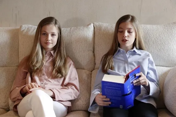 Las hijas de los Reyes Felipe y Letizia han leído una parte breve del primer capítulo del Quijote. Ha comenzado leyendo la Princesa Leonor, mientras su hermana escuchaba con atención. Tras terminar su párrafo le ha pasado el libro la Infanta Sofía. Ambas sentadas sobre el mismo sofá se han mostrado de lo más tranquilas y desenvueltas con la lectura con confianza y aplomo.