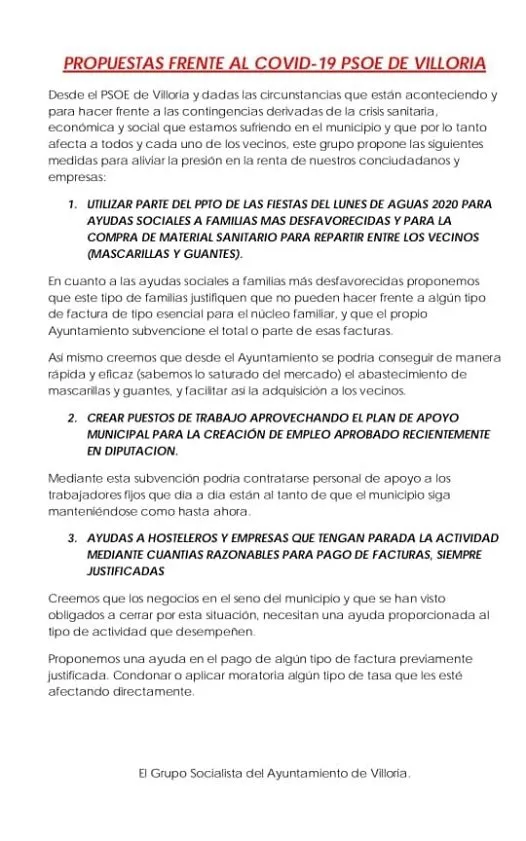 El Grupo Socialista de Villoria ha emitido un comunicado a través de su Facebook de la Casa del Pueblo de Villoria en el que exponen propuestas que han enviado al Ayuntamiento para aliviar dificultades de las familias. Además informan que la Diputación ha aprobado el aplazamiento del cobro de IBI.