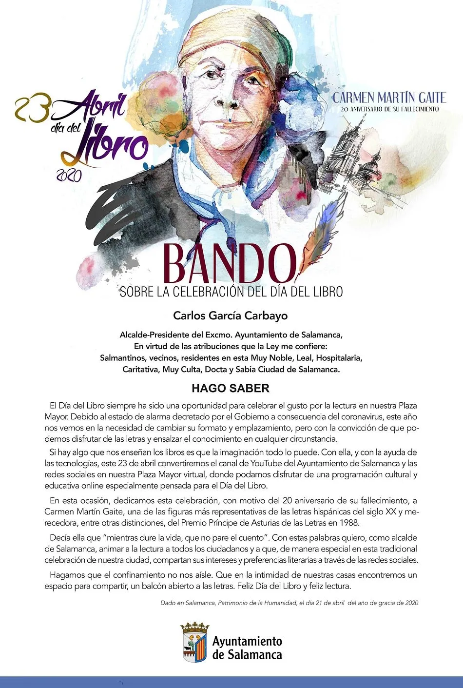 Con este fin, el alcalde, Carlos García Carbayo, ha dictado un bando que anima a los salmantinos a disfrutar del Día del Libro que este año, debido al estado de alarma decretado por el Gobierno, no se podrá celebrar en la Plaza Mayor.