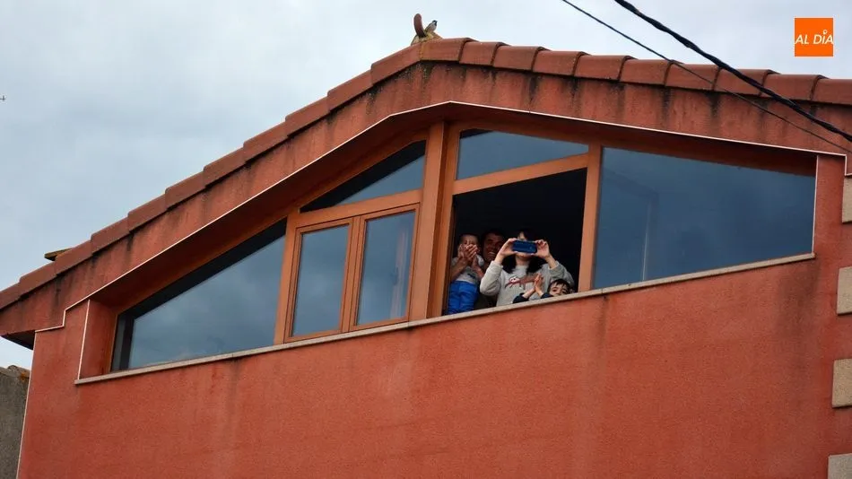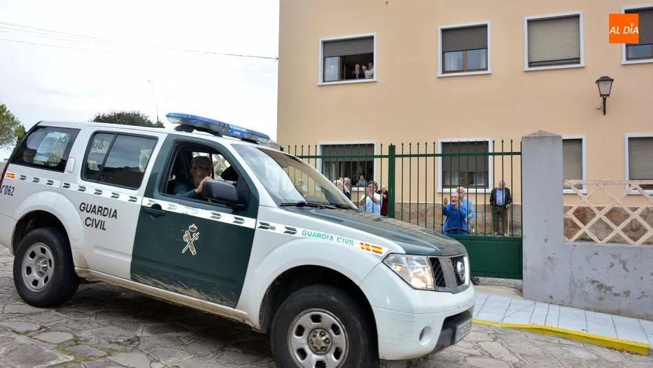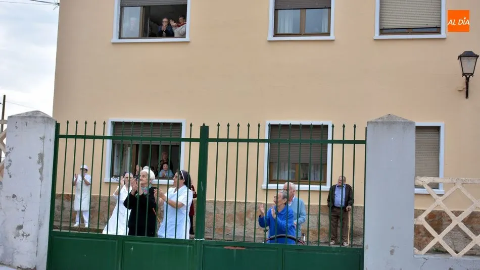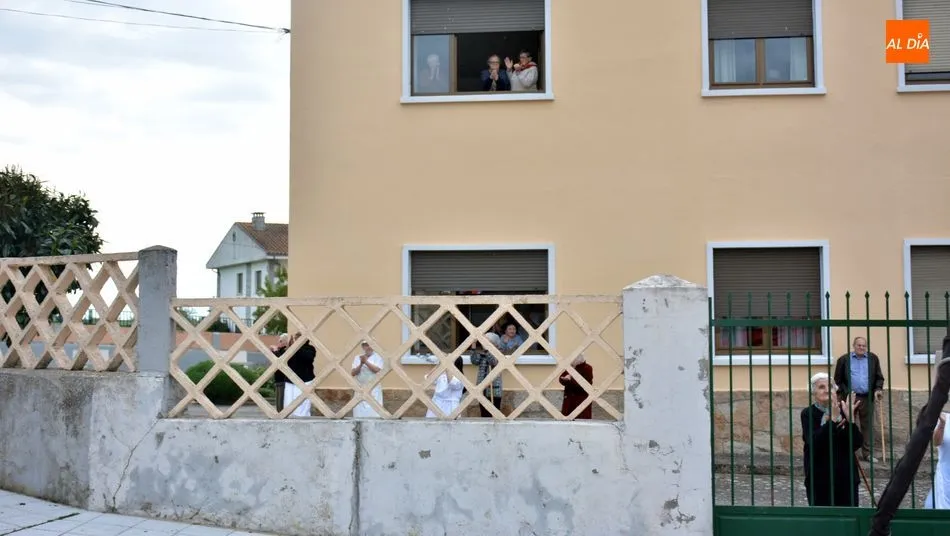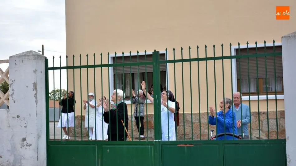 La comitiva de coches fue acogida con aplausos de los vecinos desde las ventanas de sus casas y de manera especial por los internos y los trabajadores de residencia de mayores Santa Rita, que salieron al jardín a aplaudir a los bomberos, sanitarios y miembros de la Benemérita.