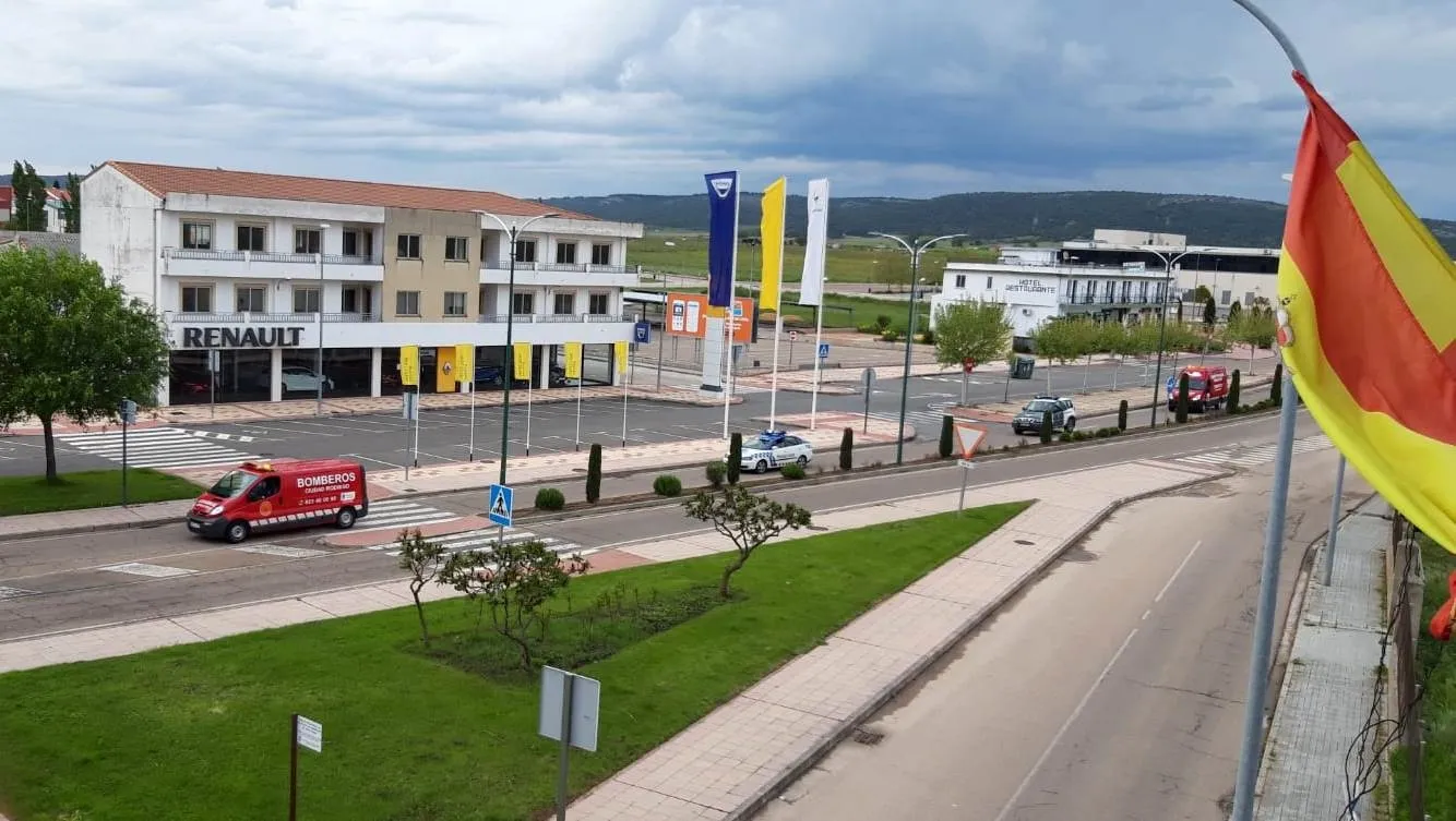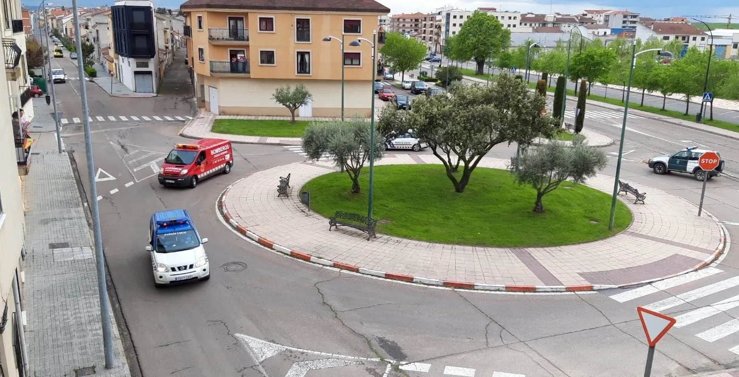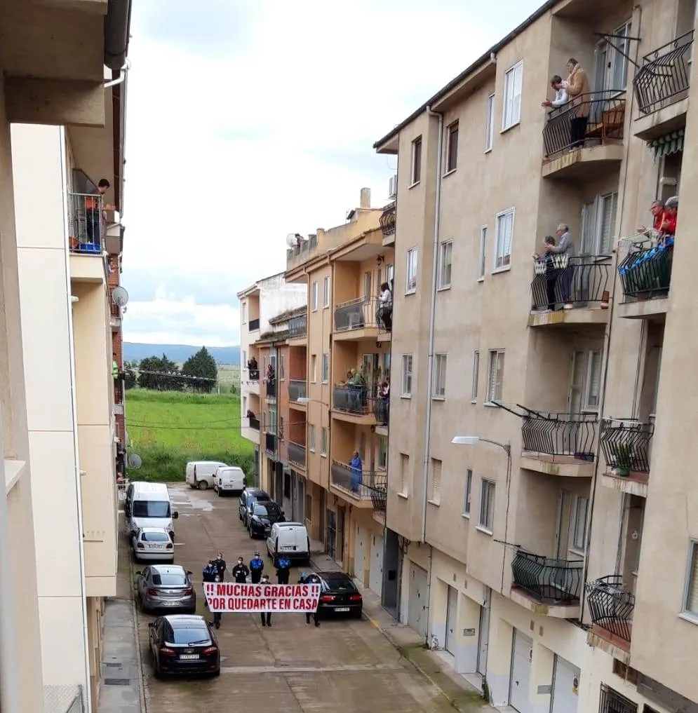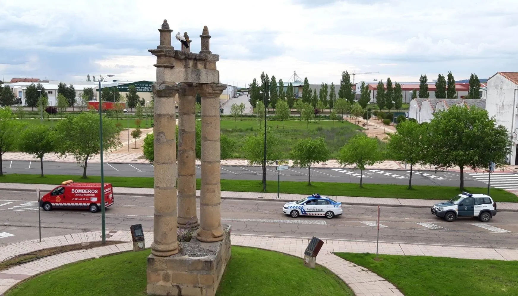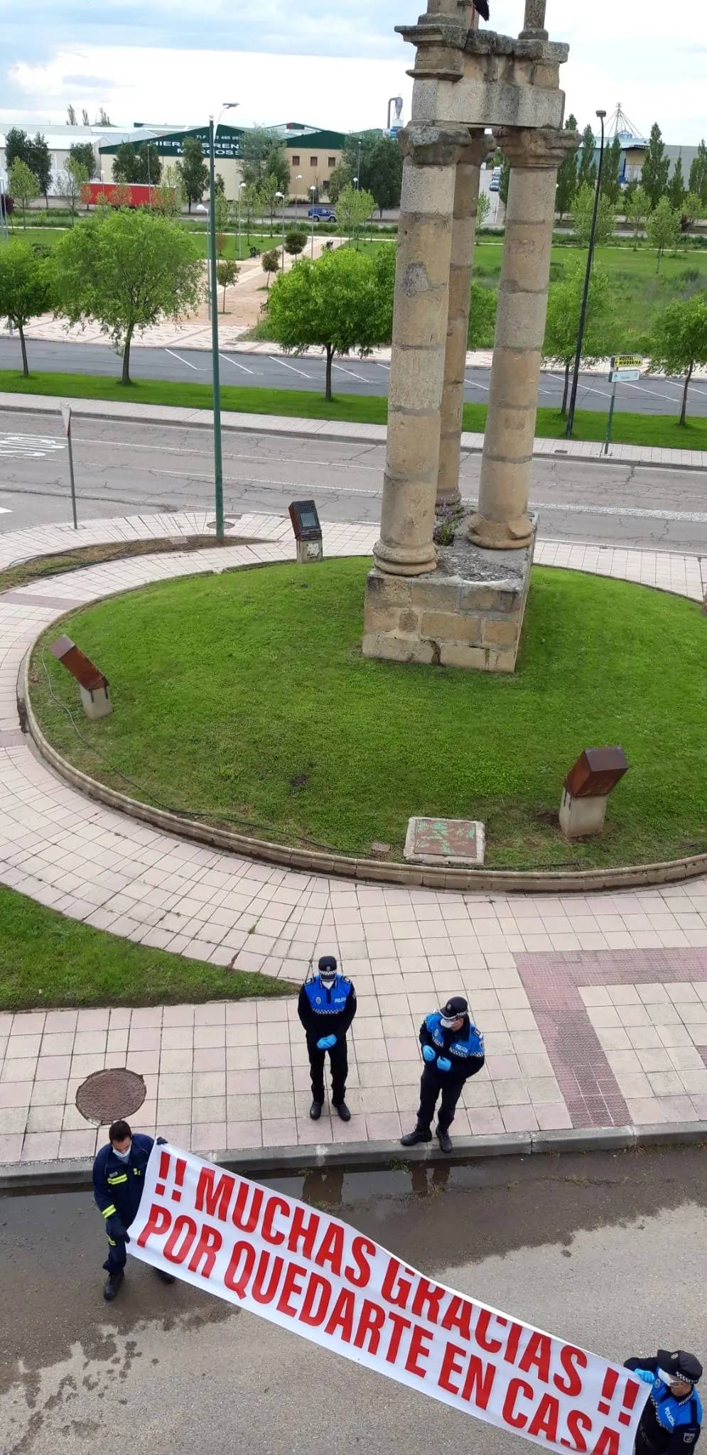 Además, durante la tarde del viernes recorrieron a pie tanto la calle Miguel Hernández como el entorno miembros de la Policía Local, la Guardia Civil y los Bomberos portando la pancarta que ya han mostrado estos días con la leyenda ¡¡Muchas Gracias!! Por quedarte en casa. Justamente coincidiendo con esa visita, una cigüeña se posó en lo alto de las Tres Columnas.
