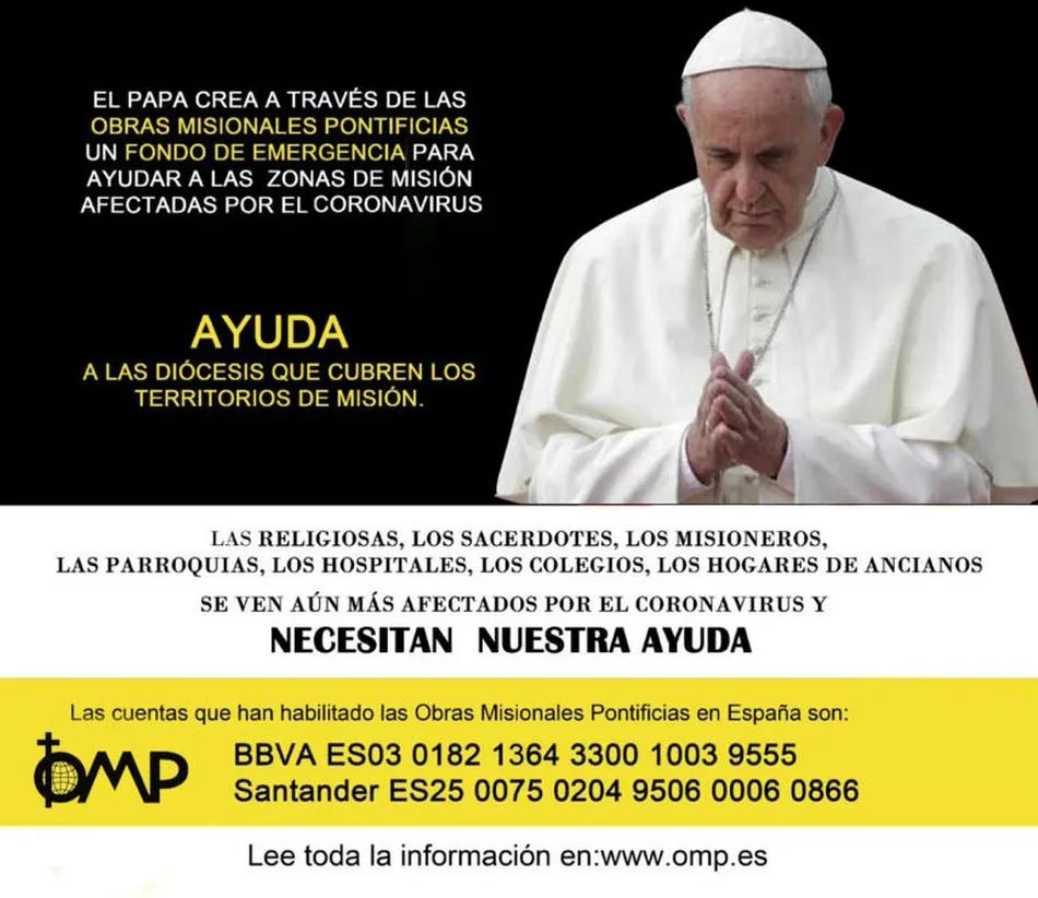 El Papa Francisco ha anunciado recientemente la creación de un fondo de cooperación con las misiones afectadas por el COVID-19. El propio Pontífice ha comenzado por dotar al fondo con 750.000 dólares. El encargado de la gestión y acrecentamiento de dicho fondo es el Cardenal Luis Antonio Tagle, prefecto de la Congregación para la Evangelización de los Pueblos, a través de las Obras Misionales Pontificias.