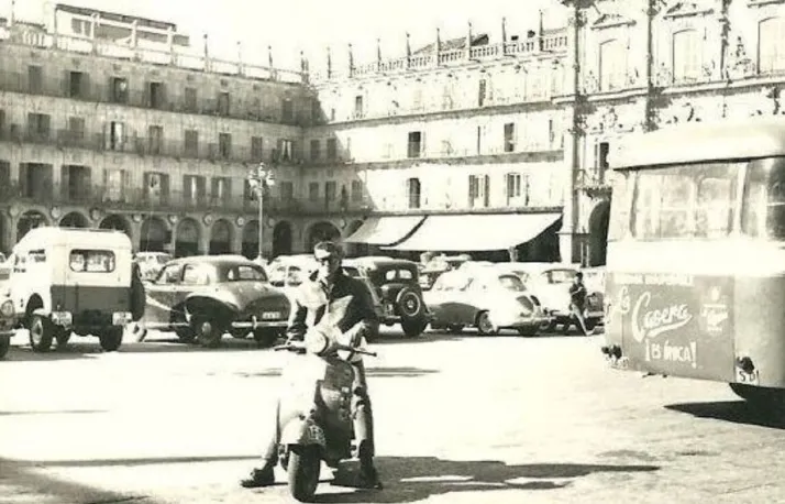 Francisco Perez Polo? divulga en las redes sociales esta foto, de autor desconocido, de Jesús Domínguez Gómez en la Plaza Mayor, famoso motorista que había participado en competiciones internacionales y había recorrido buena parte de Europa en Vespa