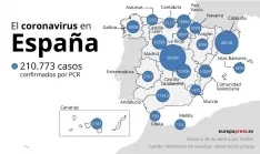 En cuanto al número de casos confirmados por PCR, el último informe publicado por el Ministerio de Sanidad muestra que 210.773 personas han dado positivo, lo que supone 1.308 más en 24 horas. Asimismo, ya se han curado 102.548 pacientes, lo que supone 1.673 más, si bien el incremento es más bajo que el registrado el lunes cuando se observaron 2.144 más curados que el domingo.