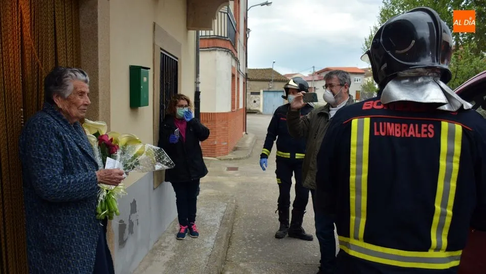 Hoy 28 de abril de 2020, Regina Villoria Arroyo ha cumplido 102 años de edad en su casa de Lumbrales, donde vive sola, bajo la atención de dos cuidadoras. El estado de alarma que vivimos estos días no ha permitido la visita de sus hijos y nietos, que residen fuera. Pero a última hora de la tarde, Regina recibió la visita de los bomberos del parque comarcal de Lumbrales, que entregaron un ramo de flores a la centenaria mientras sonaba la canción infantil Cumpleaños Feliz.