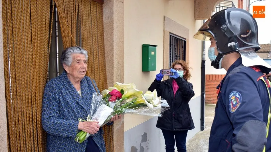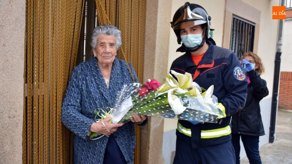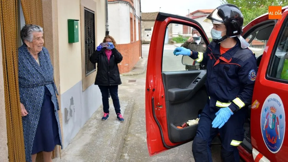 Regina Villoria Arroyo recibe la felicitación de los bomberos de Lumbrales por su 102 cumpleaños