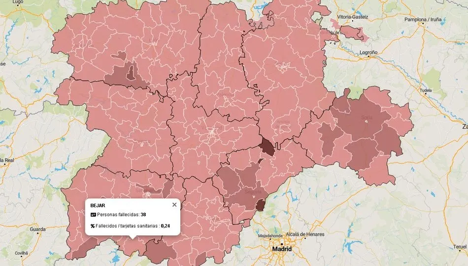 La mortalidad por COVID-19 en la zona de salud de Béjar es de 38 fallecidos confirmados por la enfermedad, dos más que ayer, el 0,24 % de las tarjetas sanitarias. La cifra global se asciende a los 105 casos, corresponden al 0,65 % de las tarjetas sanitarias registradas en la zona de salud de Béjar. La cifra de 105 casos es un dato global de mortalidad, según los datos oficiales, no vinculados exclusivamente a enfermedad por COVID-19. El Cálculo se ha realizado tomando en cuenta las bajas de tarjetas sanitarias, esta tasa se calcula con respecto a la población de cada provincia expresada por mil.