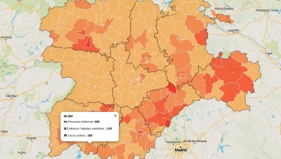 Los datos corresponden a la zona básica de salud de Béjar. Debe tenerse en cuenta que las zonas suelen abarcar más de un municipio, por lo que no debe olvidarse de que los datos corresponden a toda la zona y no exclusivamente al municipio. Los datos de número de afectados y el porcentaje de ellos en proporción al número de tarjetas sanitarias, son facilitados oficialmente por la Junta de Castilla y León.