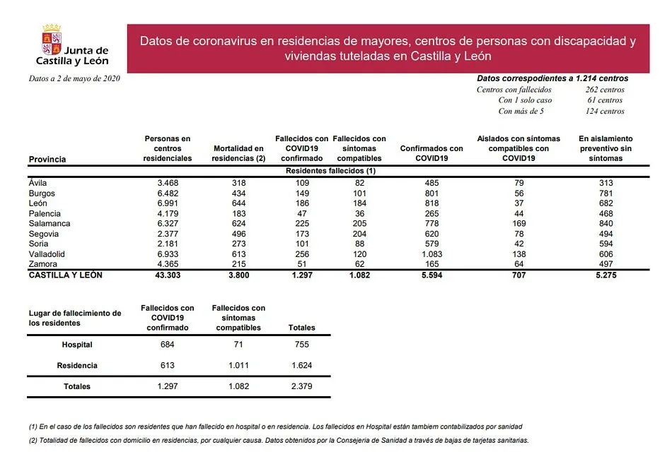 La Junta de Castilla y León ha confirmado el fallecimiento de un total de 2.379 personas alojadas en 1.214 residencias de personas mayores tanto públicas como privadas y centros públicos de discapacidad (27 más que ayer) de las que 1.297 corresponden a casos confirmados por COVID-19, 23 más que ayer, y otros 1.082 fallecidos con síntomas compatibles con el virus, cuatro más respecto al día precedente.