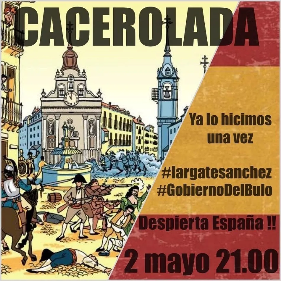 Vox ha mostrado su apoyo en la red social Twitter a una cacerolada contra el Gobierno a las 21.00 horas de hoy señalando, en alusión a la fiesta autonómica que se celebra en Madrid, que "los españoles del 2 de mayo lo hubiesen hecho".
