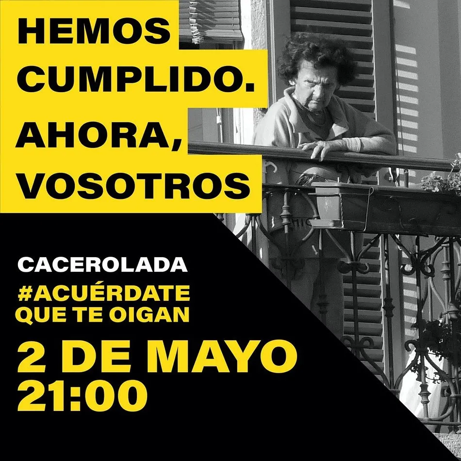 En otra imagen puede verse un dibujo que escenifica el alzamiento contra los franceses con las etiquetas #largatesánchez y #gobiernodelbulo a lo que se añade la frase "Despierta España", mientras que en la tercera se puede ver a una mujer mayor asomada a un balcón con gesto de enfado y el lema "hemos cumplido, ahora vosotros" a lo que se añade #acuérdate que te oigan.