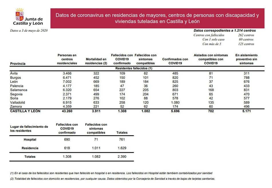 La Junta de Castilla y León ha confirmado el fallecimiento de un total de 2.390 personas alojadas en 1.214 residencias de personas mayores tanto públicas como privadas y centros públicos de discapacidad (once más que ayer) de las que 1.308 corresponden a casos confirmados por COVID-19, once más que ayer, y otros 1.082 fallecidos con síntomas compatibles con el virus, las mismas con respecto al día precedente.