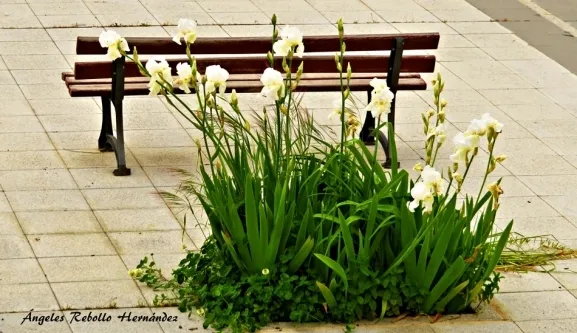 ?He aquí la metáfora: el vacío del banco (o término real), debido al confinamiento humano, parecen querer ocuparlo, de un modo tan discreto y tan hermoso...? (José Luis Puerto) / Foto de Ángeles Rebollo