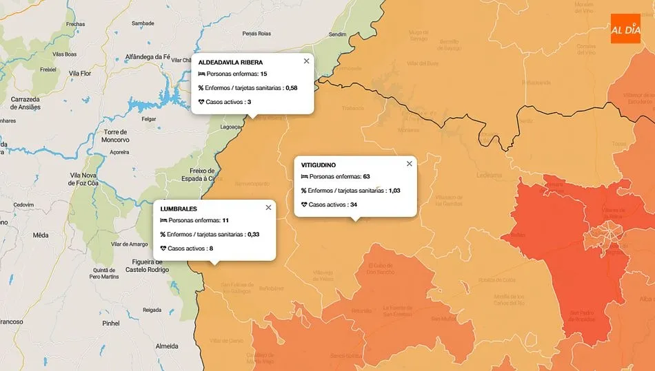 Por su parte, la ZBS de Lumbrales aún presenta 8 casos activos de 11 acumulados, aunque en los últimos 14 días no se ha registrado ningún nuevo contagio, lo mismo que sucede en la ZBS de Aldeadávila, donde aunque no ha habido nuevos contagios en las últimas dos semanas, de los 15 casos registrados desde el 29 de febrero, aún 3 permanecen activos. Tanto la ZBS de Lumbrales como la de Aldeadávila están formadas por 12 núcleos de población.