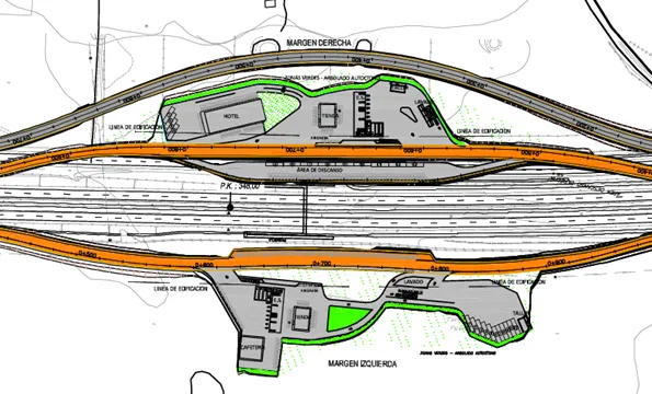 Una vez se construya, cada lateral del Área de Servicio funcionará de manera independiente, debiendo disponer cada uno de ellos de forma obligatoria de una estación de servicio con venta de lubricantes y repuestos frecuentes, una tienda-edificio de usos múltiples, una cafetería-restaurante, un bazar de productos regionales, una zona de descanso con aseos y un aparcamiento, y zona de esparcimiento y recreo.