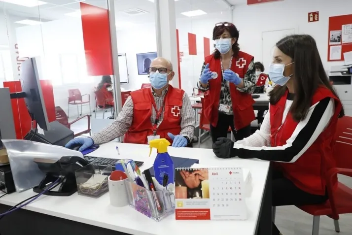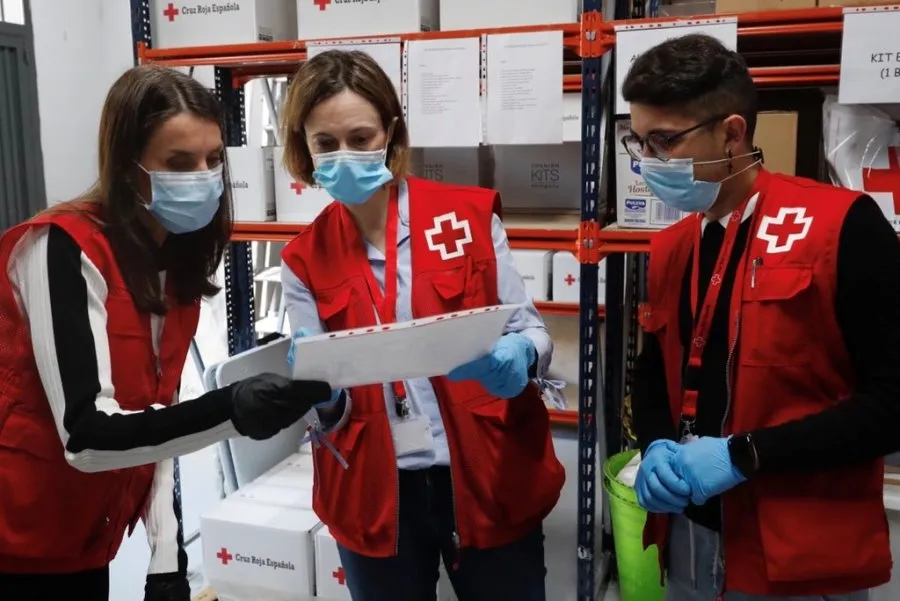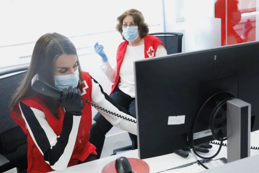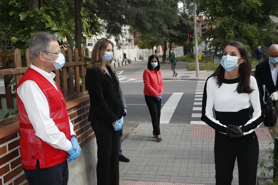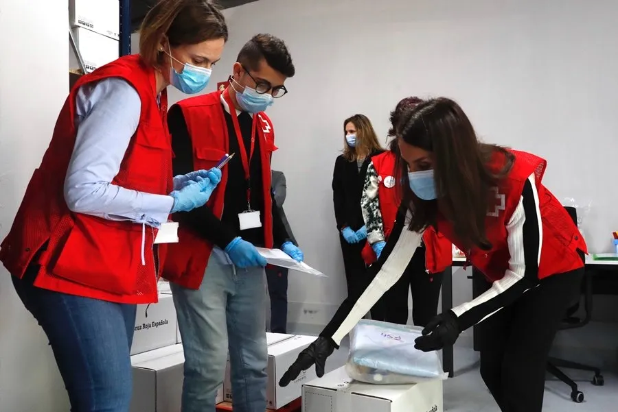 Con un look cómoda y zapato plano, la Reina Letizia se puso el chaleco rojo de la Cruz Roja, mostrando esta vez su ayuda y preocupación al pie del cañón ante la crisis ocasionada por la pandemia.