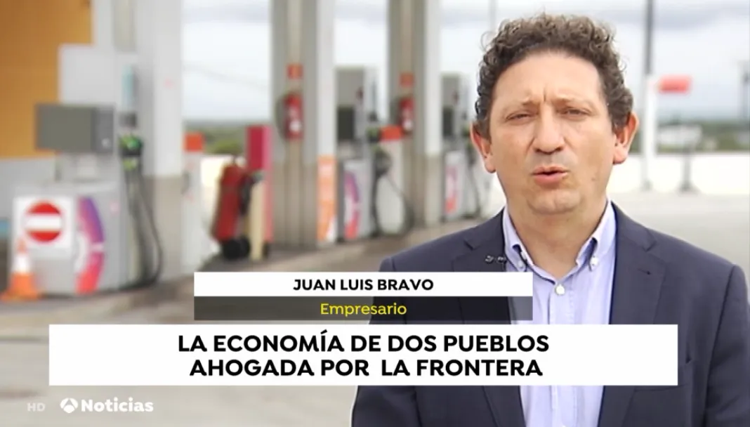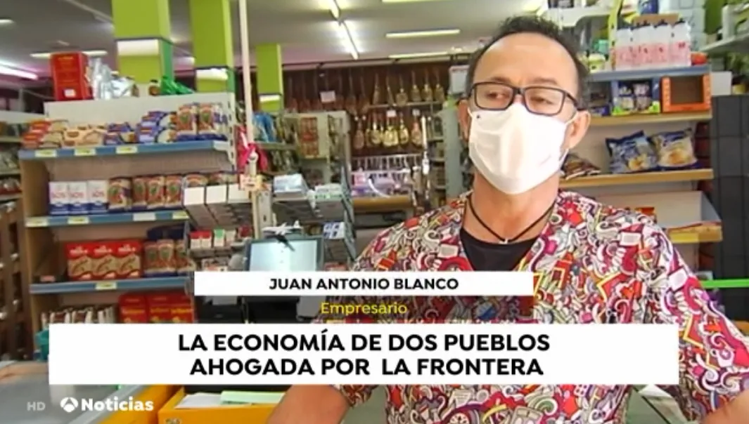 La pieza ?que mantiene casi todo el rato un rótulo con la leyenda La economía de dos pueblos ahogada por la frontera- se abre con un empresario de Fuentes de Oñoro, Juan Antonio Blanco, a quién las cámaras acompañan en su reparto a clientes por Vilar Formoso.
