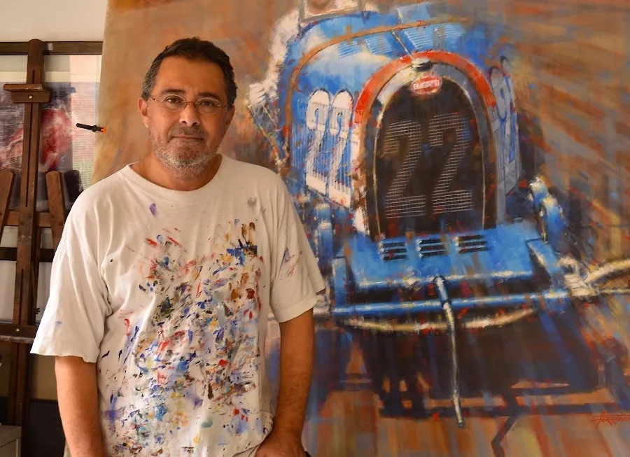 El artista, de origen argentino, actualmente afincado en la ciudad condal, presenta en esta exposición una selección de sus principales obras fraguadas en los últimos 40 años de trabajo, durante su periplo internacional dedicado a su gran pasión, el mundo del motor.