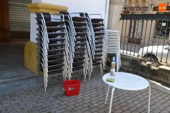 Aunque todavía no está confirmado qué establecimientos reabrirán en Ciudad Rodrigo (el presidente de la Asociación de Hostelería, Juan Ignacio Alonso, apuntaba el viernes que apenas un puñado ya lo había decidido), en la mañana del domingo ya se estaban preparando las terrazas en alguno de ellos. Por ejemplo, el responsable de La Plazuela, en la Plazuela del Buen Alcalde, estaba limpiando las sillas y mesas de su terraza.