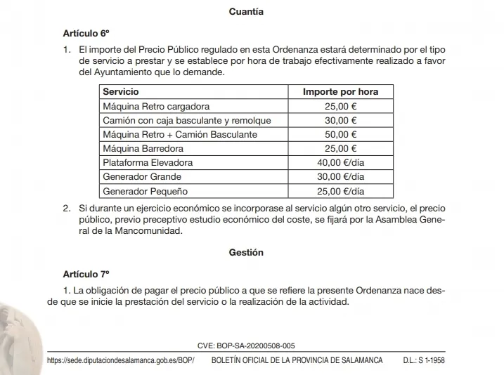 De forma que la entidad municipal que utilice cualquier equipo de los que posee esta agrupación de municipios de la esquina noreste de la provincia de Salamanca, para el aprovechamiento por parte de los mismos, ha de satisfacer el precio que dicha normativa estipula en las condiciones que en la misma figuran. Así por ejemplo el precio por hora por uso de la máquina retro cargadora, es de 25 euros la hora; el del camión con caja basculante y remolque, es de 30 euros la hora; el de la máquina retro y camión basculantes, es de 50 euros la hora; el de la máquina barredora, es de 25 euros la hora; el de la plataforma elevadora, es de 40 euros el día; el del generador grande, es de 30 euros el día; y el del generador pequeño, es de 25 euros el dia. ?Si durante un ejercicio económico se incorporase al servicio algún otro servicio, el precio público, previo preceptivo estudio económico del coste, se fijará por la Asamblea General de la Mancomunidad?, según se puede leer en el Boletín Oficial de la Provincia de Salamanca del viernes, 8 de mayo.