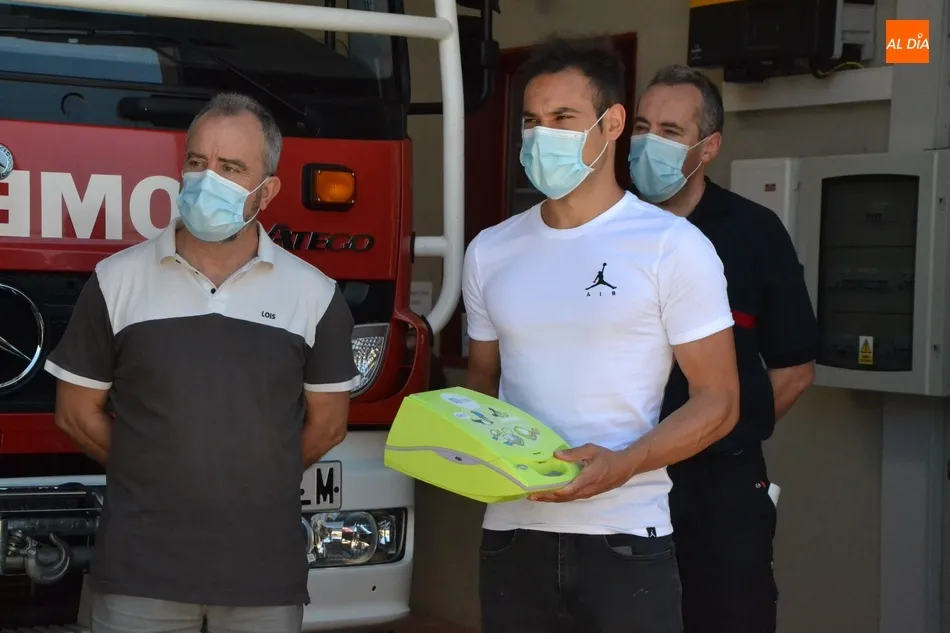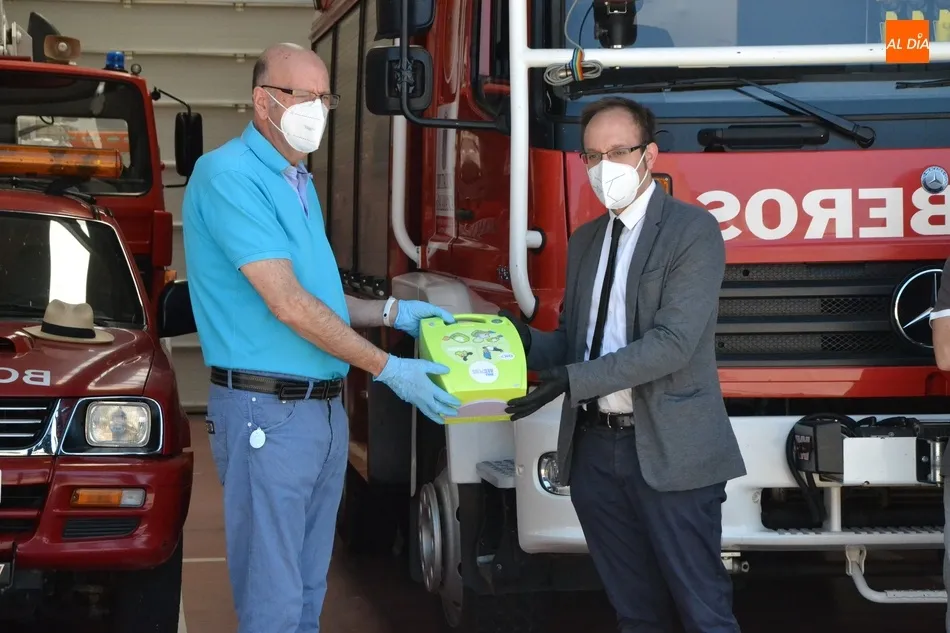 El Equipo de Gobierno del Ayuntamiento de Ciudad Rodrigo se acercó en la mañana del miércoles prácticamente al completo al Parque de Bomberos para hacer entrega al Cuerpo, por iniciativa de las delegaciones de Policía Local y Deportes, de un desfibrilador semiautomático, que a partir de ahora llevarán en sus salidas por si es necesario utilizarlo.