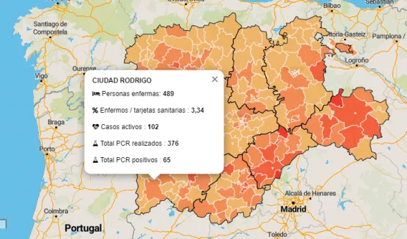 Todos estos casos se registran en una misma Zona, la de Ciudad Rodrigo, que de este modo totaliza 489 casos de personas enfermas, situándose la cifra total de las 7 Zonas Básicas de Salud en 709. De esa cifra, siguen activos (personas todavía enfermas según su historia clínica) un total de 154, tras descender la cifra en las últimas horas en una persona en las zonas básicas de Ciudad Rodrigo, Robleda y La Fuente de San Esteban, y aumentar en una en la de Tamames (pese a lo cual su cifra total de personas enfermas no varía).