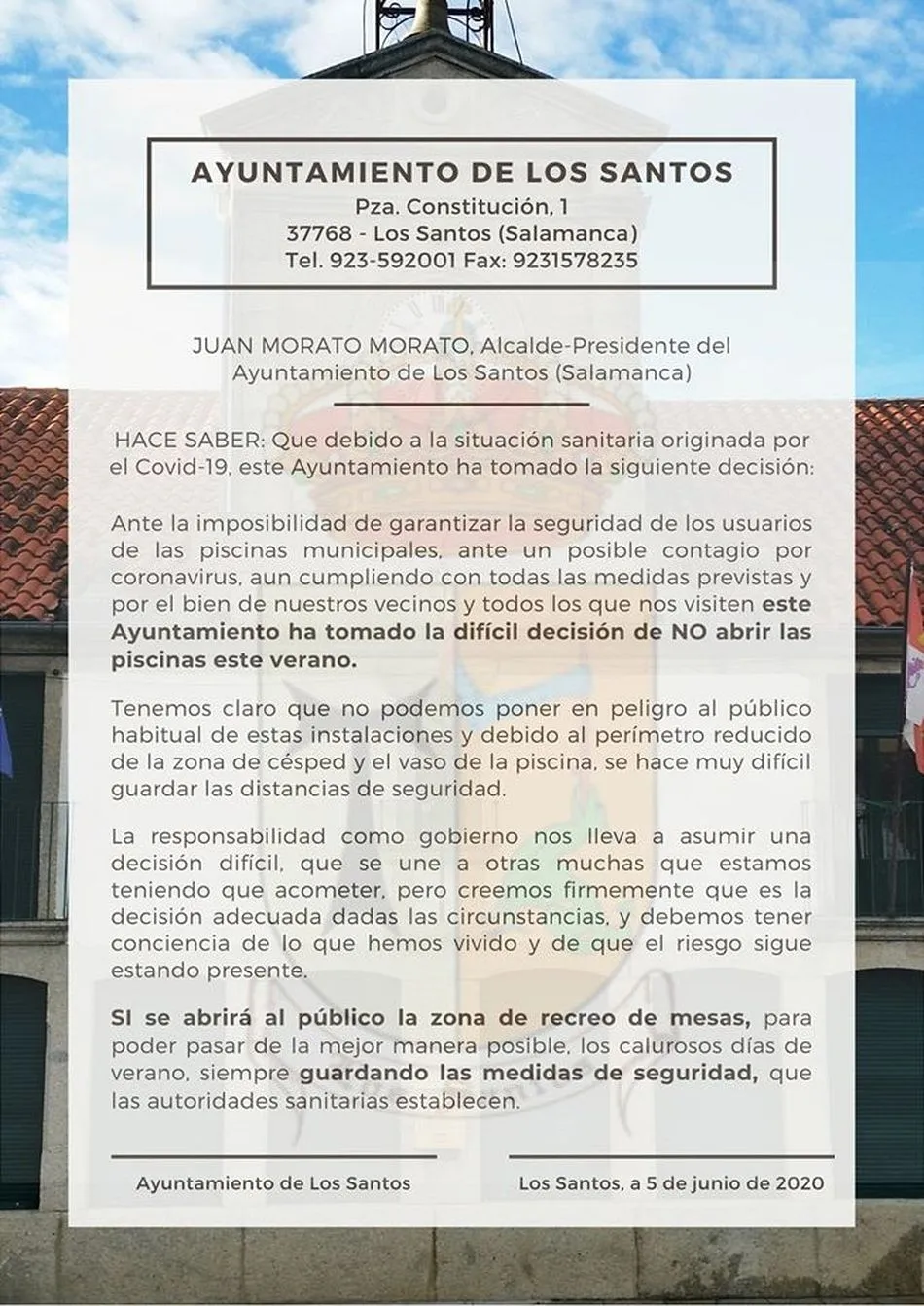 Esta semana se han sumado las localidades de Ledrada, Los Santos, Santibañez de Béjar y Sorihuela, cuyos ayuntamientos ya han anunciado que no abrirán sus instalaciones de baño el próximo verano como de medida de precaución ante el coronavirus, reduciendo así un posible foco de contagios.