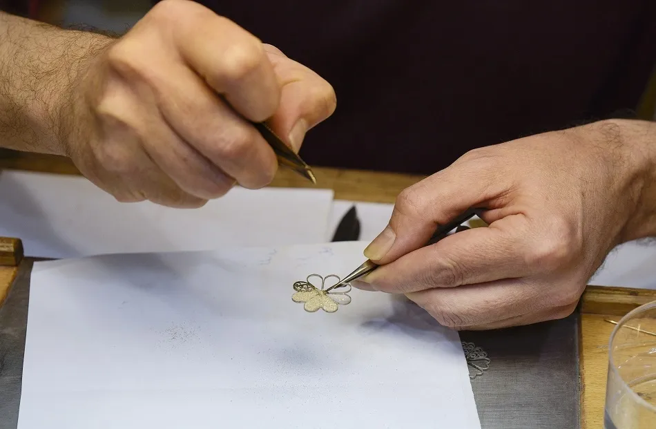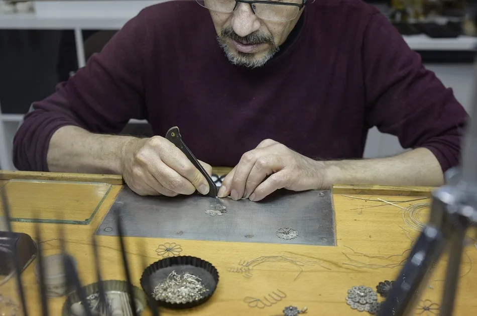 Yo aprendí a los 14 años, acabé EGB y empecé a trabajar en el taller con mi padre, algunos de mis hermanos estudiaron carreras vinculadas con el arte, sí, y todos estamos ligados a la joyería. Y esos primeros conocimientos, esa habilidad, bueno, es como montar en bicicleta, que dicen que no se olvida. Yo si llevo mucho tiempo sin estar en el taller, siento que no se me olvida; pierdes rapidez, pero ciertos movimientos no se olvidan nunca como la forma de cortar el hilo, la colocación de las manos? usar el banco del joyero?