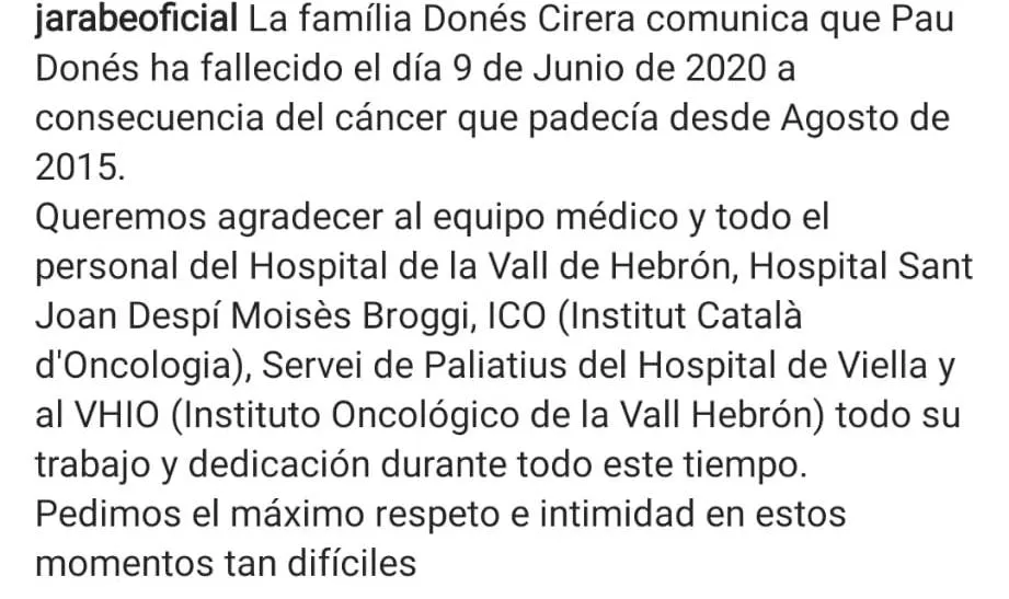 "La família Donés Cirera comunica que Pau Donés ha fallecido el día 9 de junio de 2020 a consecuencia del cáncer que padecía desde agosto de 2015. Queremos agradecer al equipo médico y todo el personal del Hospital de la Vall de Hebrón, Hospital Sant Joan Despí Moisès Broggi, ICO (Institut Català d'Oncologia), Servei de Paliatius del Hospital de Viella y al VHIO (Instituto Oncológico de la Vall Hebrón) todo su trabajo y dedicación durante todo este tiempo. Pedimos el máximo respeto e intimidad en estos momentos tan difíciles" han sido las palabras que han utilizado sus compañeros para avisar por redes sociales del fallecimiento del artista.