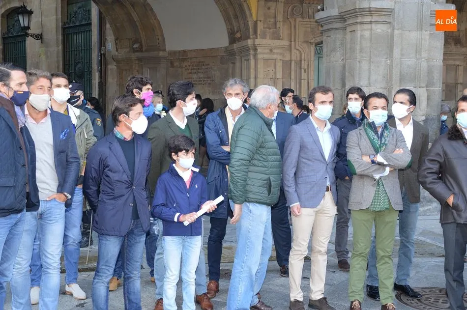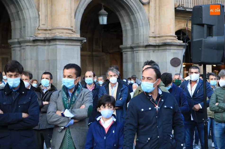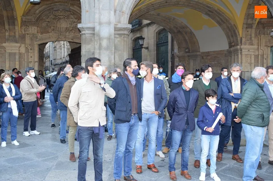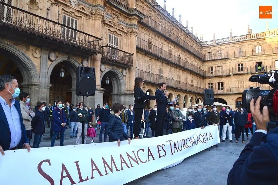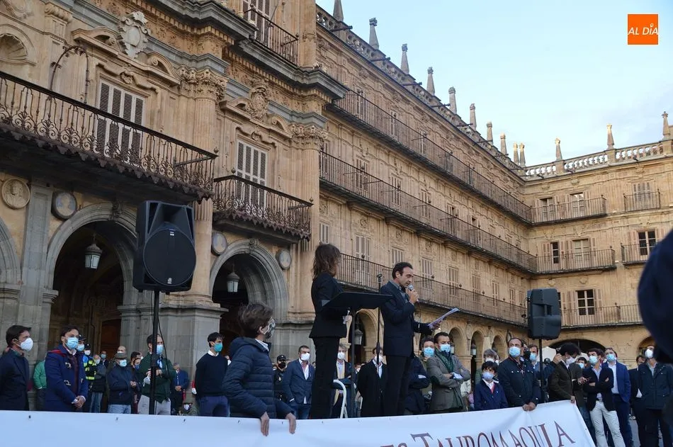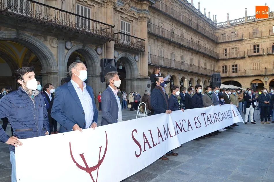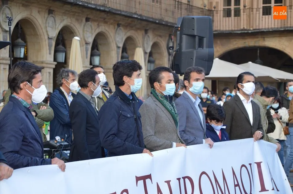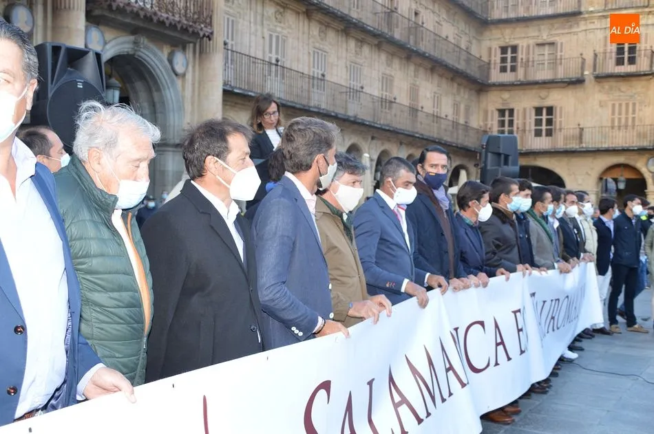 Miles de personas respondieron este viernes a la llamada del colectivo ?Salamanca es Tauromaquia? con un llenazo en la Plaza Mayor y el mundo del toro volvió a dar una lección reivindicado ?respeto? al sector con la presencia de las principales figuras del toreo como Ponce, Manzanares, Castella, Juli, Perera, Ureña, Urdiales, Pablo Aguado, Manuel Escribano, Jiménez Fortes o Cristina Sánchez como representante de la Fundación Toro de Lidia. Los diestros salmantinos, como no podía ser de otra manera, apoyaron la causa, así como ganaderos, banderilleros, recortadores, empresarios taurinos y centenares de aficionados llegados de todos los puntos de la provincia. Además, todos los presentes mantuvieron un minuto de silencio por los fallecidos por la pandemia de coronavirus.
