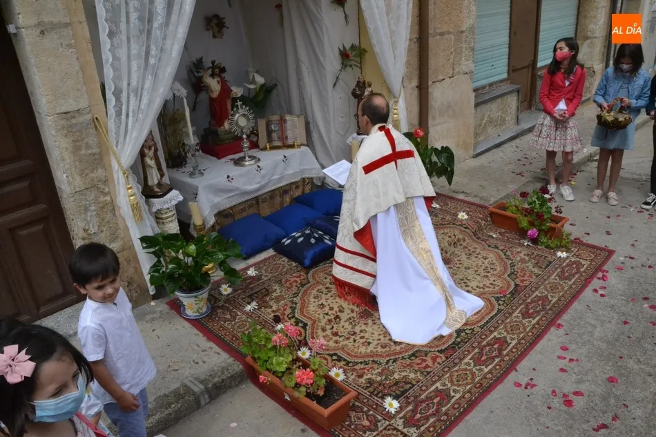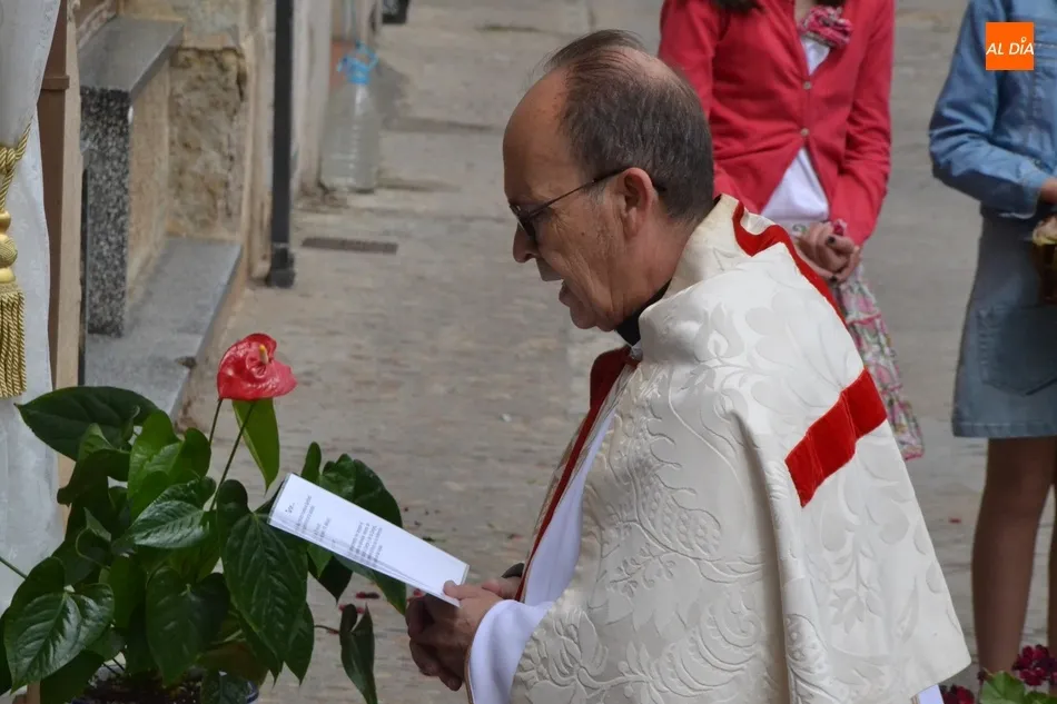 Sin llegar a ser una procesión propiamente dicha, a la conclusión de la Eucaristía que se celebró a las 11.30 horas en esta Parroquia se asomó a la calle para bendecir este altar el Santísimo Sacramento, que fue portado por el párroco Tomás Muñoz Porras, a quién acompañaron en esta salida callejera los miembros del Coro de la Parroquia que estaban animando musicalmente la Eucaristía.