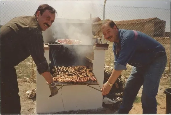 Eso. Y también hicimos incontables-barbacoas-(ver foto). Alguna demostración multitudinaria de ?sidra asturiana- con amigos escanciando sin parar el sabroso líquido y bebiendo del rico producto? ¡Sí! Y terminando cantando? ¡Asturias tierra querida! Hasta tuvimos la suerte de ser acompañados por el gran salmantino-Sayagués- (Ver foto). Actor en-?Amar es para Siempre? y director teatral; que dejó sus gafas y mandil ?aparcados? y no tuvo que atender a clientes como en ?su? Bar Televisivo.