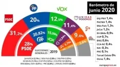 El Barómetro de Opinión del Centro de Investigaciones Sociológicas (CIS) correspondiente al mes de junio vuelve a situar al PSOE en cabeza manteniendo una estimación de voto del 31,2% pese a la crisis del covid 19, y aumentando a 11,2 puntos su ventaja sobre el PP, al que sitúa en el 20%.
