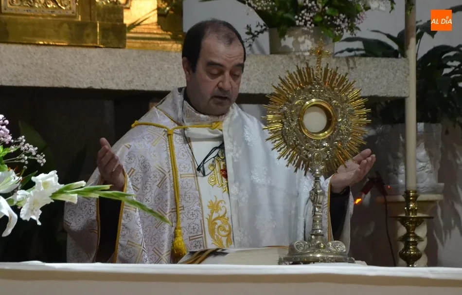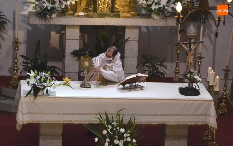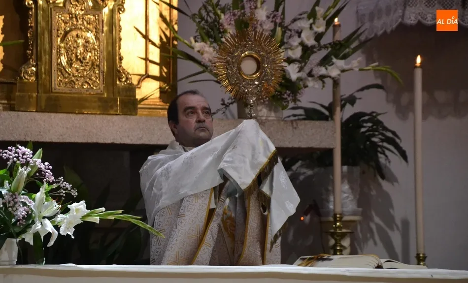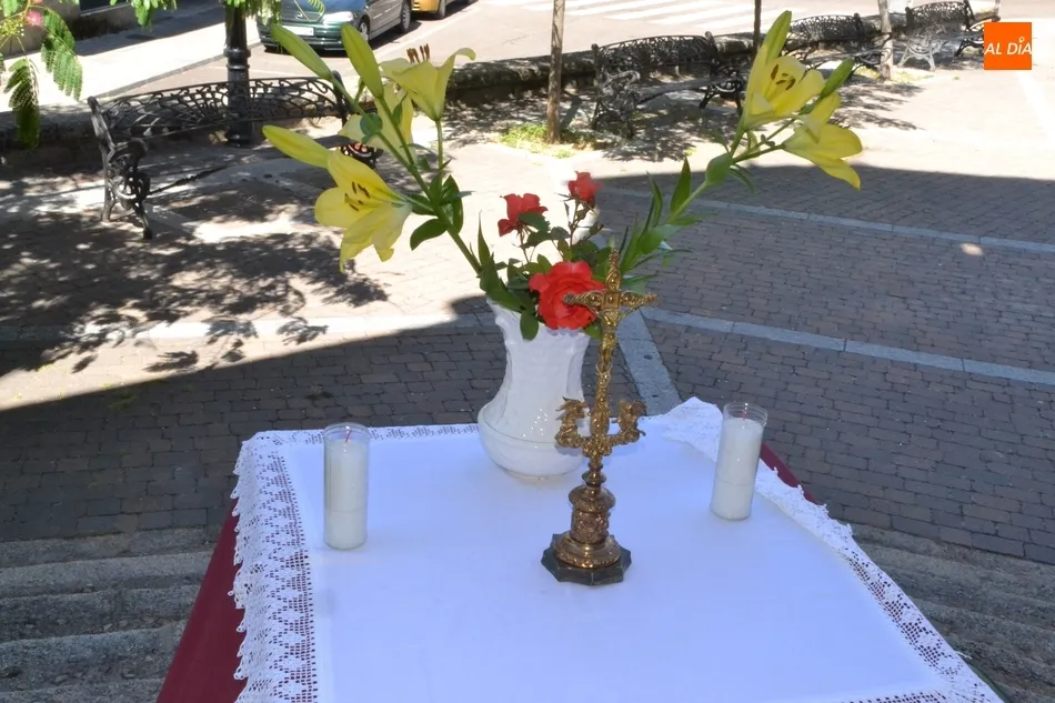 El párroco Rafael Caño colocó en cada uno de esos altares la custodia en la que iba el Santísimo Sacramento, que como explicó el párroco no es la que se suele sacar en procesión a las calles en este barrio, sino que, aprovechando la brevedad del recorrido, había cogido una de mayor peso, que prácticamente no se usa (de hecho él no la había usado todavía en el tiempo que lleva al frente de la Parroquia).