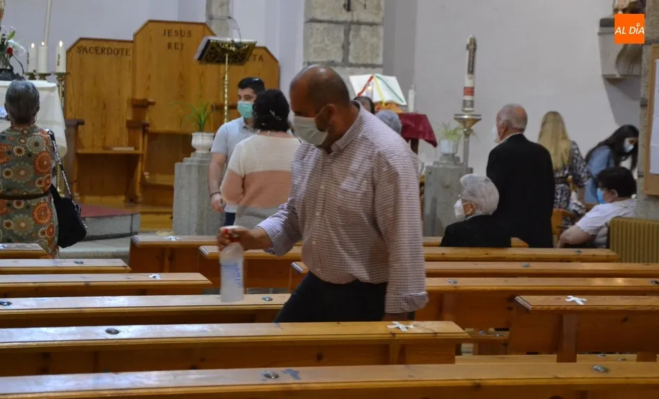 Concluida la procesión (que estuvo precedida por la habitual misa de las 11.30 horas, animada por los coros), se dio por finalizada la celebración, comenzando acto seguido la obligada desinfección del templo para que estuviera listo para la siguiente misa.