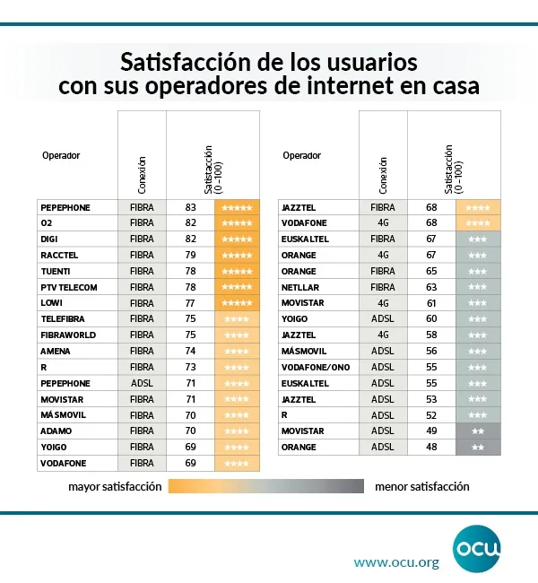 Según la OCU, los clientes de fibra de Pepephone, O2 y Digi son los más satisfechos