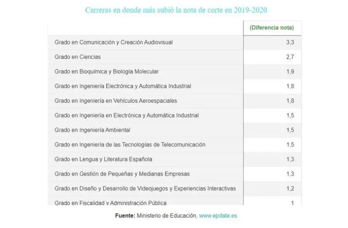Carreras con más nota de corte Entre las carreras con nota de corte más elevada en el curso 2019-2020 destacan títulos relacionados con la ciencias de la salud como Biomediciona, Bioquímica o Medicina, además de carreras técnicas como Ingeniería en Tecnologías Aeroespaciales o Ingeniería Electrónica, Robótica o Matemáticas e Informática, aunque también hay en los primeros puestos carreras de las ciencias sociales como Filosofía, Política y Económica. Para elaborar este ránking se ha hecho la media de la nota de corte de todas las universidades que ofrecen los distintos grados. No se tiene en cuenta los doble grados.