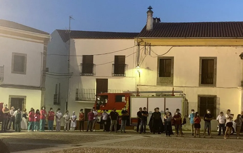 A continuación, se mencionó a la Guardia Civil, ?verdaderos ángeles de la guarda, han estado pendientes de todas las idas y venidas, y las salidas de casa de cada uno de nosotros?, con un trabajo ?discreto y generoso?. Tras tomar la palabra el sargento, fue turno para los Bomberos, con cuyo paseo cada día ?nos alegraron este confinamiento; estábamos deseando que pasaran por nuestra calle con la música y sus sirenas?. En este caso intervino Pablo Martín Ingelmo, presidente de los Bomberos de Fuenteguinaldo, que llevaron un camión a la Plaza.