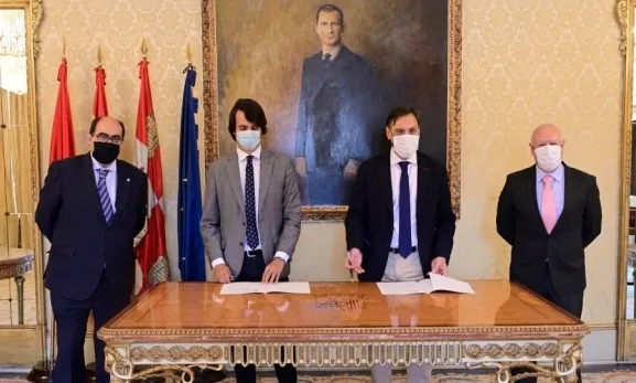 El alcalde de Salamanca, Carlos García Carbayo, y el director de Relación de Instituciones para Castilla y León de BBVA, José Manuel San Millán, han firmado esta mañana un convenio de colaboración con la finalidad de apoyar a los autónomos y a las pequeñas y medianas empresas de Salamanca afectados por la crisis generada por la pandemia del coronavirus.