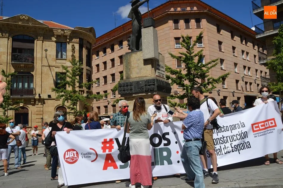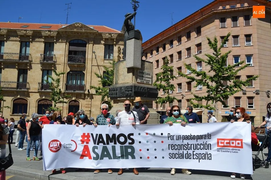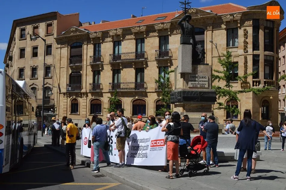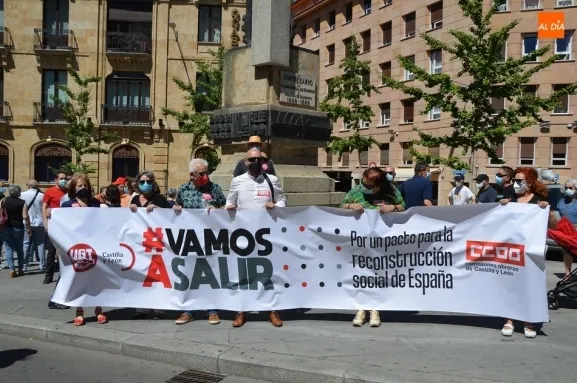 Los sindicatos CCOO y UGT han convocado 50 concentraciones este sábado en todo el territorio nacional para pedir la reconstrucción social y económica del país tras la pandemia. Salamanca ha sido una de esas ciudades, que a partir de las 12.00 horas ha vivido la manifestación en la Gran Vía, junto a la plaza del Empresario. Numerosos simpatizantes y miembros de ambos sindicatos han reclamado un mayor reconocimiento al mundo del trabajo y los derechos laborales como medio para salir de la crisis provocada por el coronavirus.
