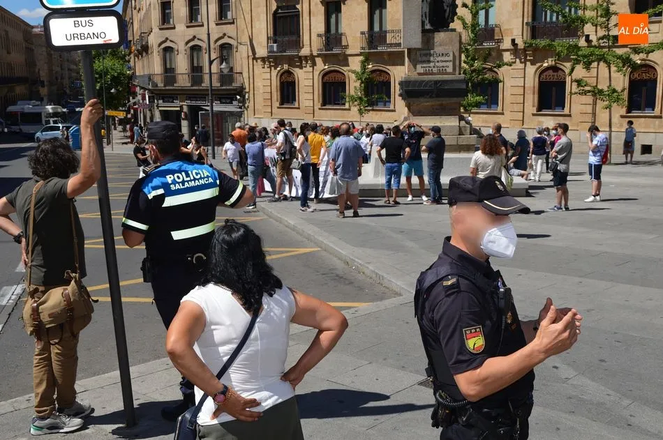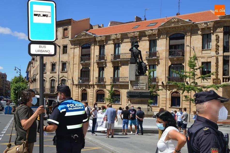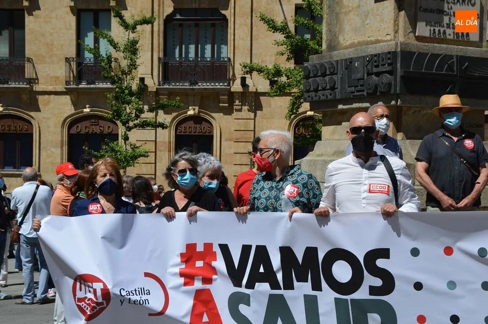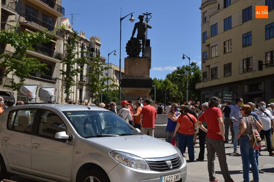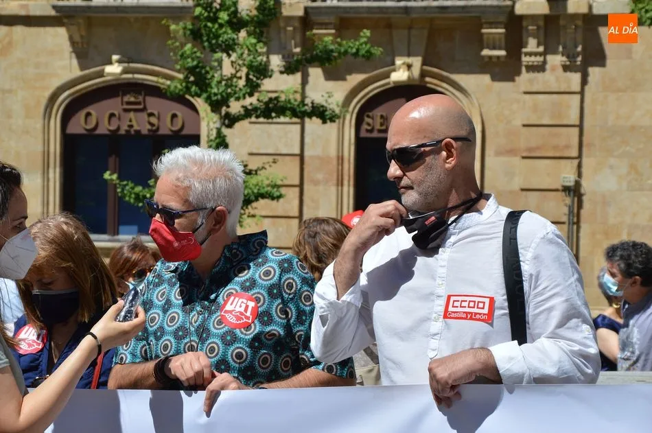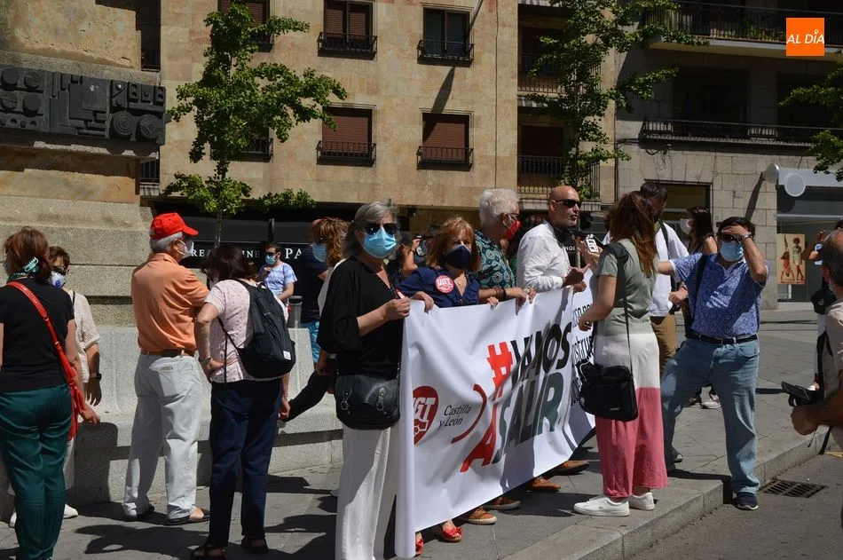 Entre los presentes y tratando de guardar la distancia social, representantes sindicales han portado la lona con el mensaje de la concentración, entre otros el secretario general de CCOO Salamanca, Emilio Pérez, y miembros de la gestora de UGT Salamanca.