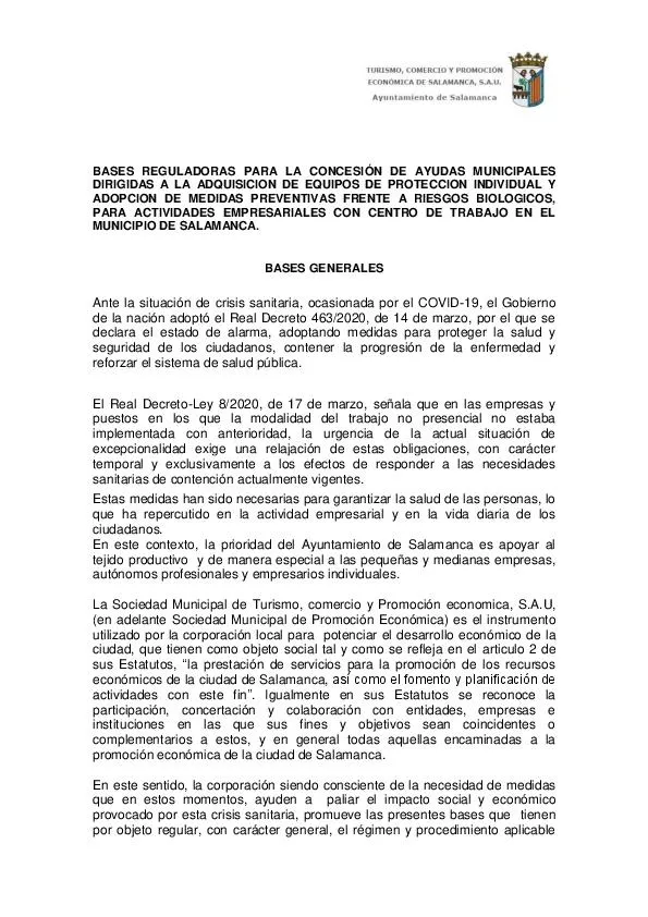 En esta situación excepcional frente a la COVID-19 la prevención es fundamental, y dentro de las medidas extraordinarias que desde el Ayuntamiento de Salamanca se ponen al servicio de la recuperación de la actividad económica y del empleo, están las ayudas dirigidas a las pequeñas y medianas empresas de la capital de Salamanca para la adquisición de equipos de protección individual y adopción de medidas preventivas frente a riesgos biológicos, con la finalidad de garantizar la salud de los trabajadores.