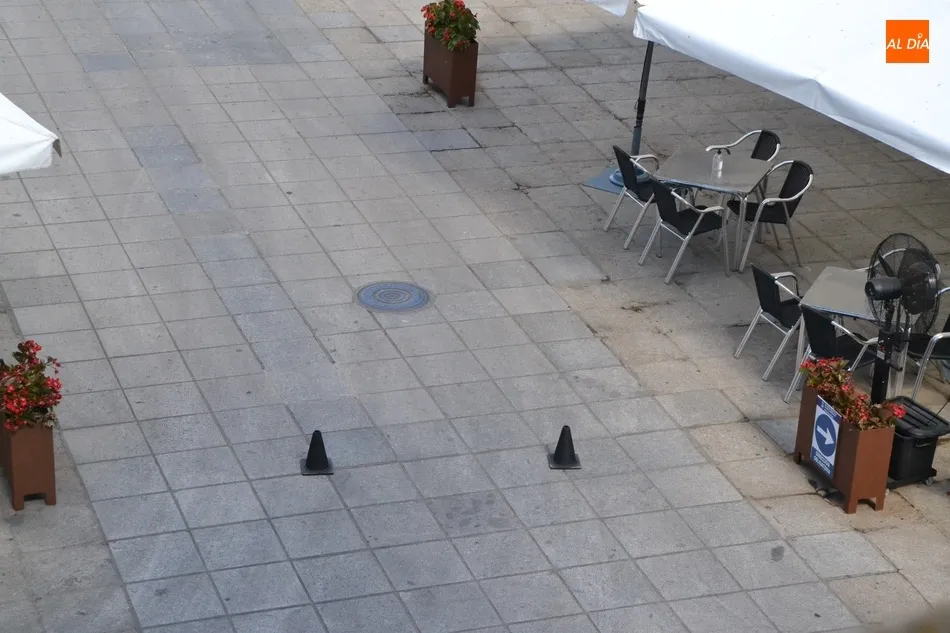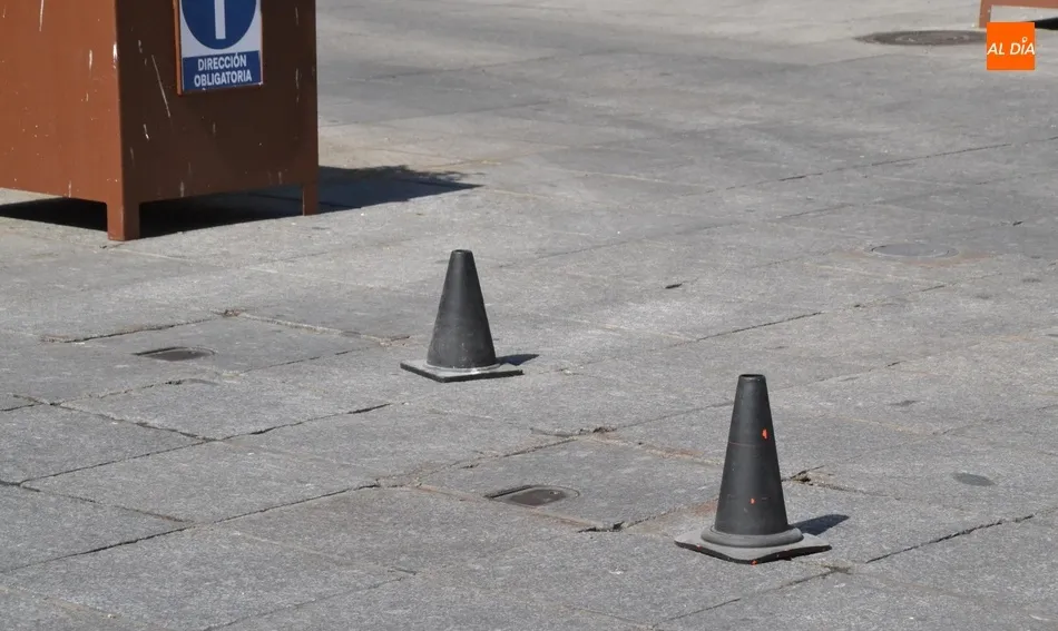 Colocados unos conos para forzar a los conductores a seguir rectos en la Plaza Mayor
