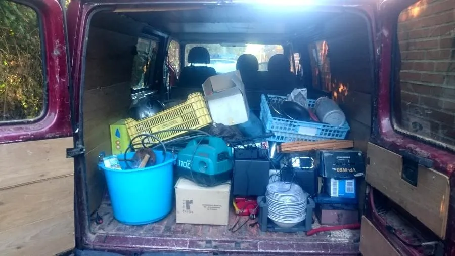 La llamada de un vecino facilitó la intervención policial. En el interior de la furgoneta había herramientas como destornilladores, martillos, cinceles, menaje de cocina, libros, un Home cinema, una hidrolimpiadora y otros efectos.